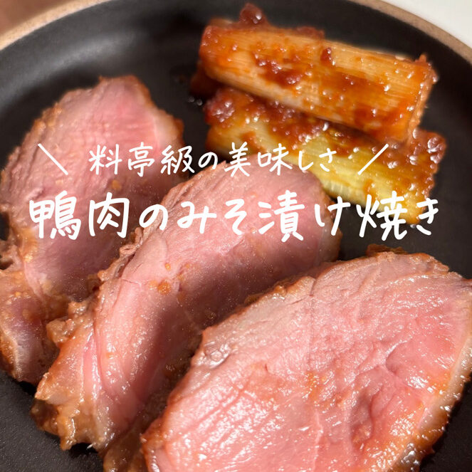 1. 鴨は皮目に浅く格子切り+塩少々。味噌だれに漬け、冷蔵で半日。